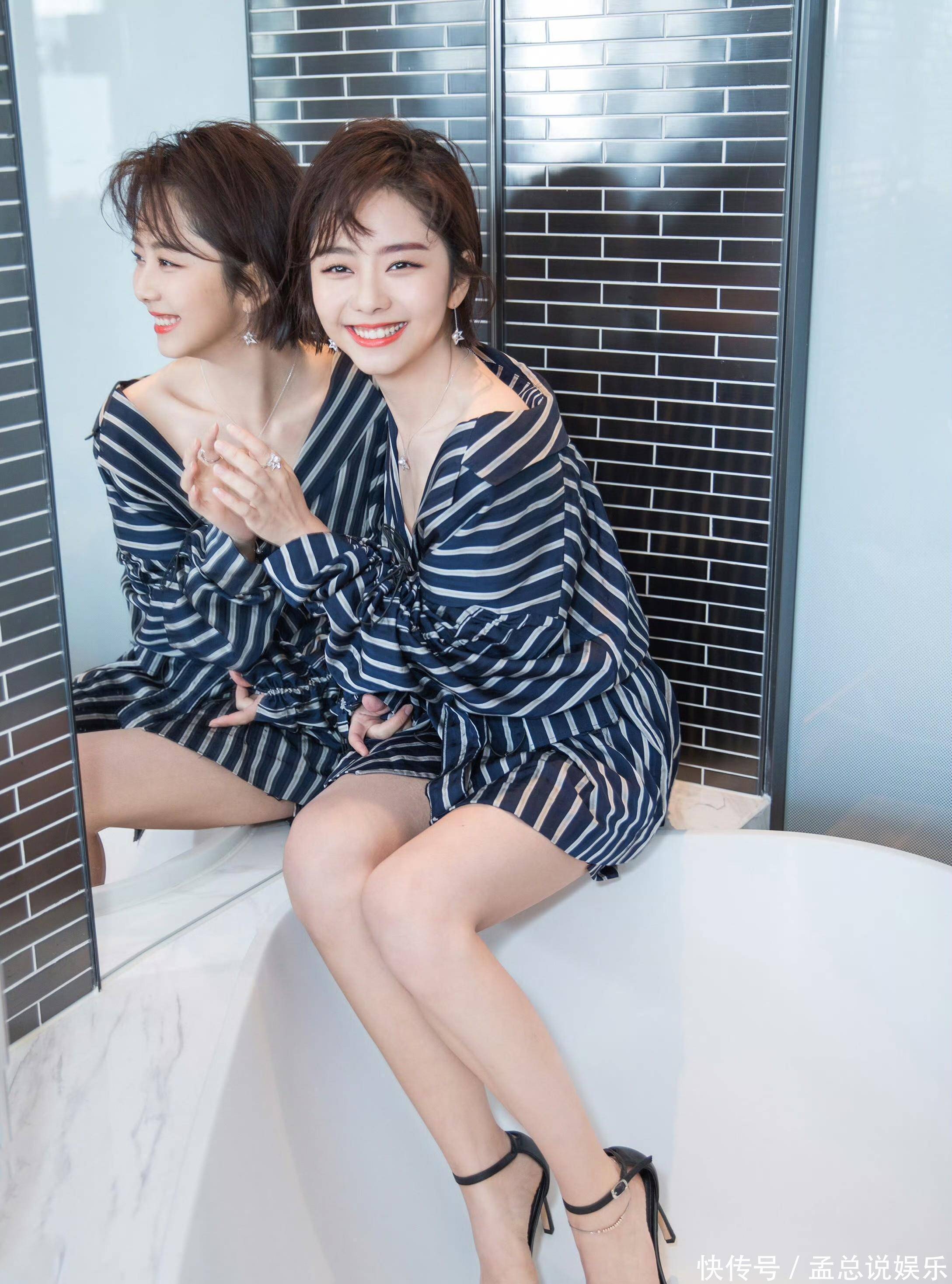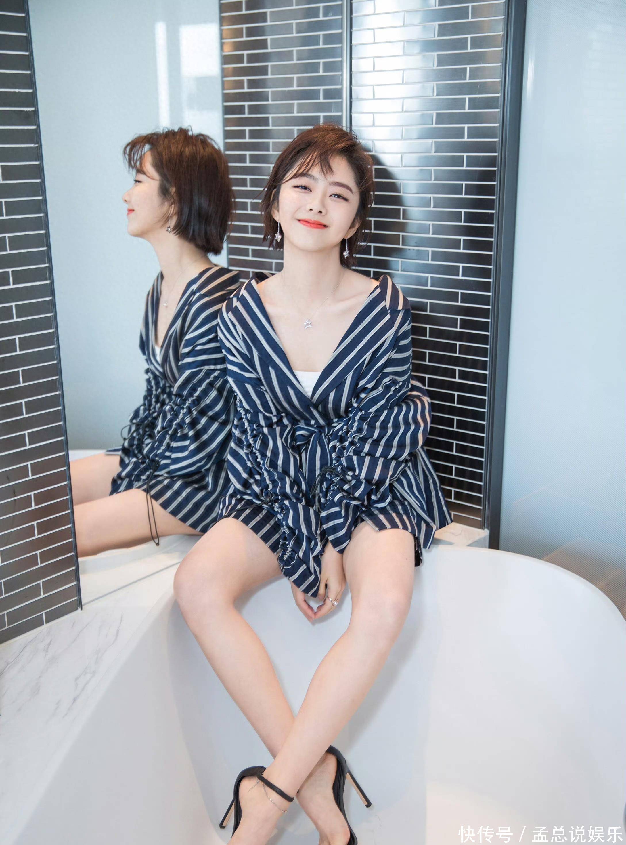 镜头里的谭松韵身着藏蓝条纹宽松裙装,慵懒的版型搭配利落的短发,将随性与精致完美融合。深V领口勾勒出纤细的脖颈线条,点缀的细钻项链又添几分小女人的温柔,黑白条纹的经典碰撞,让简约的穿搭多了几分设计感。她坐在白色浴缸边缘,双腿交叠搭配黑色细高跟,娇俏的眉眼间带着笑意,灵动的神态瞬间拉满少女氛围,很难想象这是已经三十多岁的她。