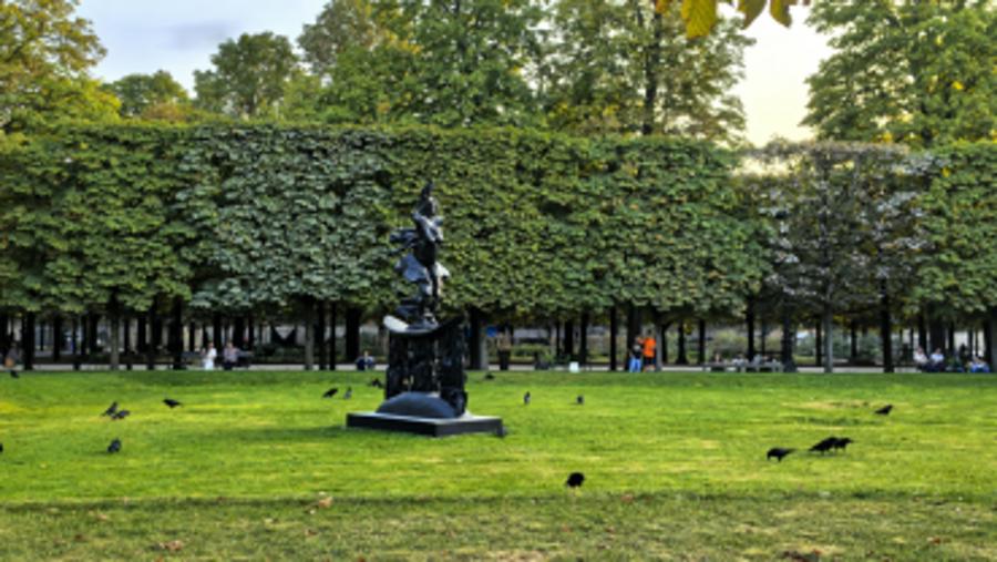 再往前,可以远远地看到杜乐丽花园另一侧协和广场上的方尖碑,以及3公里之外的凯旋门,轴线的尽头是巴黎的中央商务区拉德芳斯。尽管花园的主轴线一望无垠,但沿着两侧的小径又别有洞天,绿植草坪、喷泉水池、座椅雕塑,多为大师匠心之作,“露天博物馆”果然名不虚传。当然,少不了的打卡环节,就是在花园的东门,我静静地瞻仰了好一会儿勒·诺特尔的雕像。