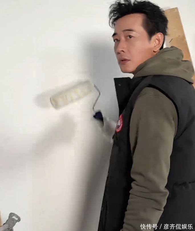 可以看到,画面中的罗先生一开始背对着镜头,手中拿着粉刷墙面的工具,在装修房子。他的身上穿着一件深绿色的连帽卫衣,卫衣的外面还套了一件黑色的马甲,下半身是牛仔裤。
