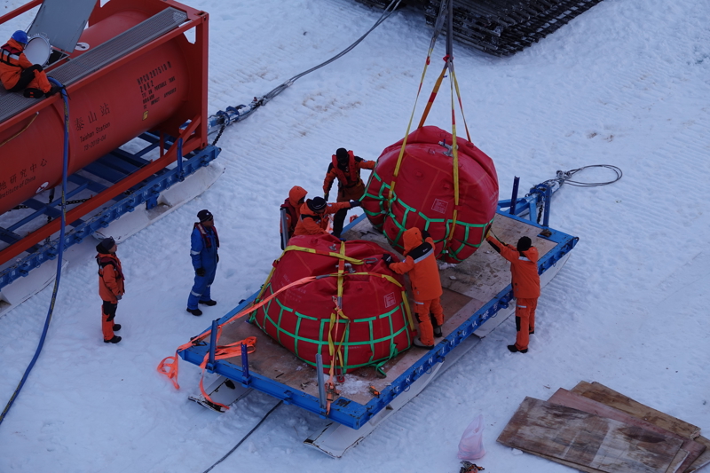 北京时间12月3日凌晨,工作人员在“雪龙2”号船侧冰面开展油囊装车作业。近日,正在执行中国第42次南极考察任务的“雪龙”号抵达南极中山站外围陆缘冰。“雪龙2”号已于北京时间11月25日率先抵达该区域。两船正协同开展中山站区域大规模卸货作业。本次作业将累计完成约2000吨各类物资卸运。按计划,整体卸货作业将持续约15天。据“雪龙2”号轮机长李文明介绍,“雪龙2”号是首次为考察站补给燃油。\n 新华社记者 顾天成 摄