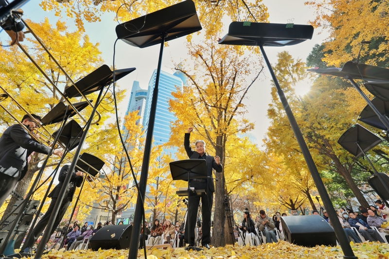 12月6日中午,市民游客聚集在上海音乐厅广场上的银杏树下,欣赏一年一度的“银杏音乐会”。今年的音乐会以“杏会金响”为主题,由上海铜管重奏团演绎。乐团还邀请了上海交响乐团、上海歌剧院交响乐团、杭州爱乐乐团的多位音乐家带来风格多元的作品。“银杏音乐会”已陪伴沪上爱乐者走过12年,为这座城市的秋冬景色增添温暖。 解放日报记者 赖鑫琳 摄