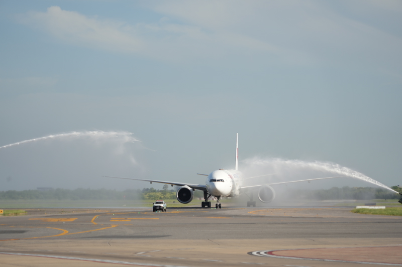 12月4日,中国东方航空公司MU745航班抵达阿根廷首都布宜诺斯艾利斯埃塞萨国际机场后通过“水门”。这标志着中阿两国之间首条直航航线开通。\n 新华社记者 张铎 摄