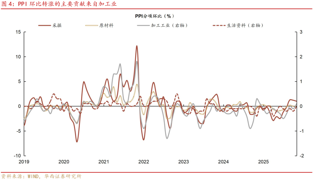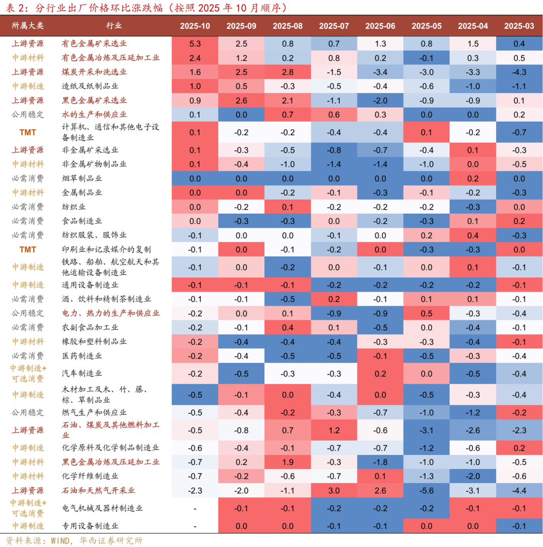PPI环比上涨,主要是加工业价格转正,环比涨0.1%,明显好于9月的-0.1%。而加工业权重占到PPI的接近50%,可见PPI环比转涨的主要贡献来自加工业。一方面是反内卷政策效应释放,光伏设备及元器件制造价格上涨0.6%,锂离子电池制造上涨0.2%,汽车制造业环比降幅也收窄0.3个百分点至-0.2%。另一方面,AI资本开支带动全球存储芯片涨价,推动计算机整机制造、集成电路制造环比分别涨0.5%、0.2%。此外,国际有色金属价格上行,带动国内有色金属矿采选业价格环比涨5.3%、有色金属冶炼和压延加工业价格涨2.4%。
