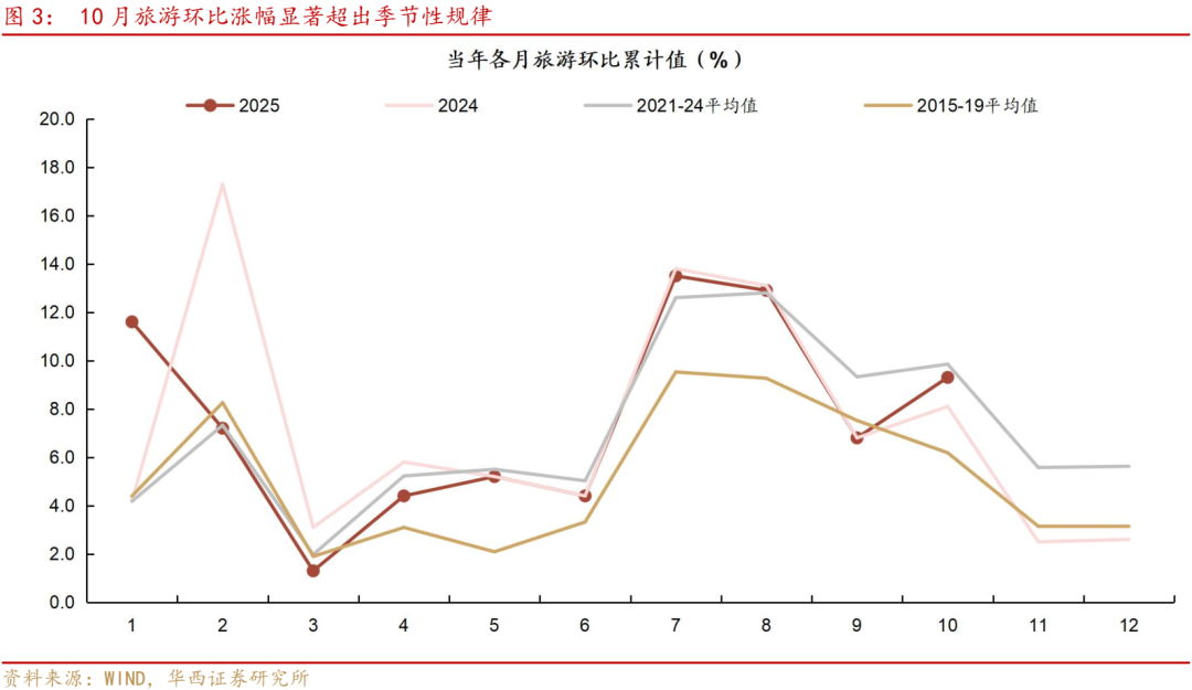 一是服务价格环比涨0.2%,其中旅游分项环比涨2.5%,今年中秋假期与国庆假期重叠,导致出行需求向10月集中。宾馆住宿、飞机票和旅游价格分别上涨8.6%、4.5%和2.5%,涨幅均高于季节性水平。2020年也曾出现过中秋与国庆假期重叠的情况,10月旅游分项环比涨幅高达2.8%。2015-2024年间,两个节日非重叠年份的旅游分项环比平均值为-0.5%。此外,医疗服务环比涨0.5%,连续第七个月上涨。
